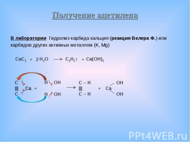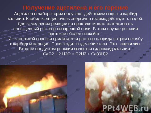 Карбид кальция, взаимодействуя с водой, быстро разлагается с образованием газообразного ацетилена и гашеной извести: