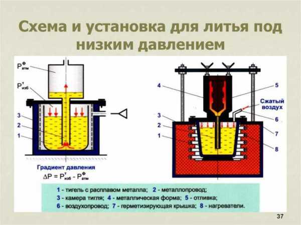 В середине ХХ века был изобретен и запатентован новый метод литья, суть которого состоит в подаче расплава в форму и его остывания под низким избыточным давлением воздуха. Метод применяется для изготовления деталей из цветных металлов, их сплавов и пластмасс.