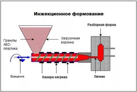 - Инжекционный. Наиболее употребляемый способ, характеризуется высоким давлением и скоростью впрыскивания материала в форму. Применяется для изделий сложной геометрии, с тонкими или толстыми стенками.