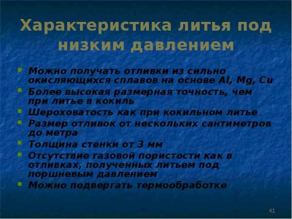 Литье под низким давлением завоевало заслуженную популярность в цветной металлургии. Большая часть деталей малых, средних и больших серий для многих отраслей промышленности получают этим способом.