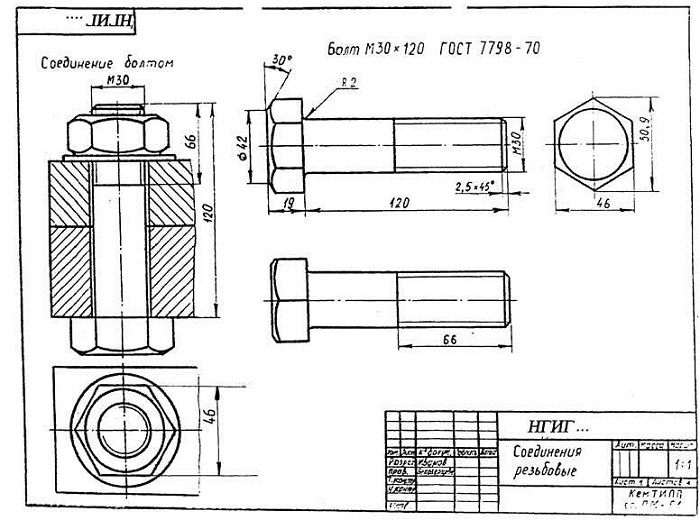 На сборочных чертежах и чертежах общих видов шестигранные гайки и головки болтов рекомендуется изображать без фасок на головке болта, на гайке и на конце стержня болта. Допускается на общих видах не указывать зазора между стержнем и отверстием, если для этого нет особых причин.