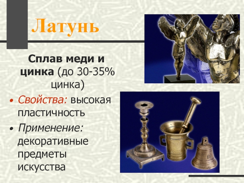 Латунь – это тоже сплав с медью, но в отличии от бронзы главным легирующим элементом выступает цинк.