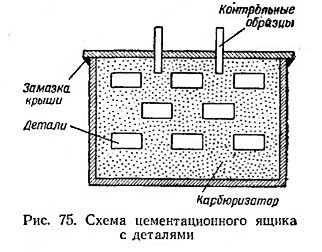 Цементацию твердым карбюризатором производят в цементационных ящиках из листовой стали толщиной 8—10 мм. Ящики, заполненные деталями и карбюризатором, помещаются в печь и нагреваются без доступа в них воздуха до температуры 920—950° С в течение нескольких часов. По окончании цементации детали охлаждают вместе с ящиком. [c.236]