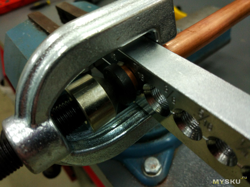 - Край трубки вставить в инструмент для развальцовки и воспользоваться им по назначению;