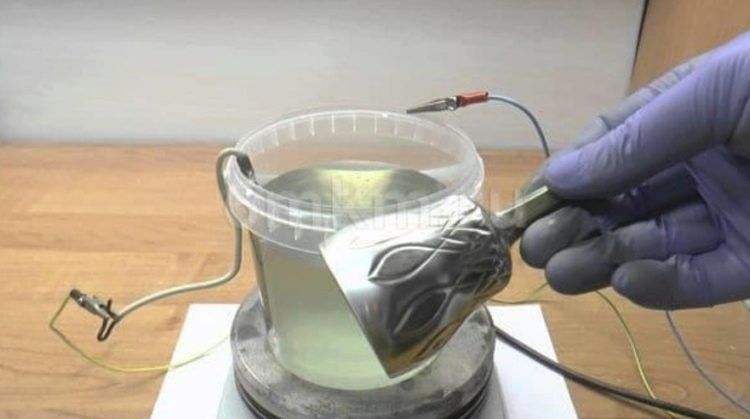 В пластиковую тару необходимо налить литр воды и растворить в ней 25 граммов кислоты. В полученном растворе требуется смочить мягкую губку и аккуратно нанести средство на изделия. Спустя треть часа требуется смыть все чистой водой и тщательно промыть изделия в мыльном растворе.