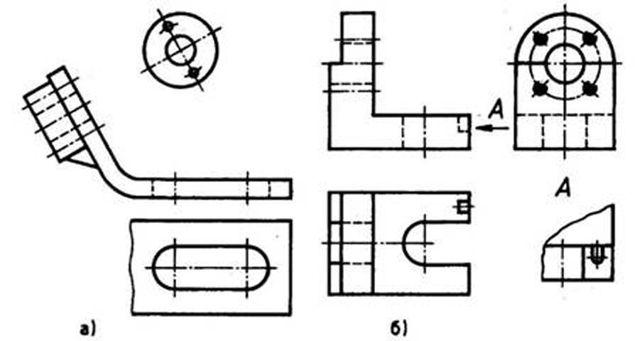 В тех случаях, когда возникает необходимость выполнить проекцию не на стандартные направления, используются дополнительные виды. К примеру, если деталь содержит части, расположенные под углом, повернутый элемент будет не до конца отражен на основных видах, а дополнительный покажет его без искажений.