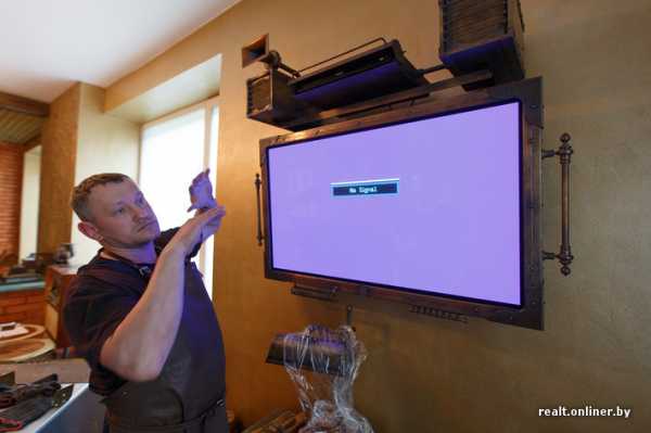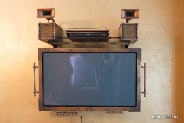 Дмитрий продолжает показывать свои работы: «Это одна из первых моделей плоских телевизоров. Корпус у нее был традиционный — серебристый пластик, и меня это совершенно не устраивало, так как дома у нас все в желтом металле. Больше года он пылился в коробке, пока я за него, наконец, не взялся. Теперь телевизор в медном „чехле“, все кнопки рабочие (их дизайн был позаимствован у духовых музыкальных инструментов). Единственная бутафория на нем — расположенный рядом с клавишами змеевик, это просто украшение. Потом добавил к телевизору чехол для DVD-проигрывателя, колонки, сделанные из старой „Радиотехники“. Колонки сверху в виде раструбов тоже рабочие. Мой знакомый занимается рупорной акустикой, и я сделал их точно по его чертежам».