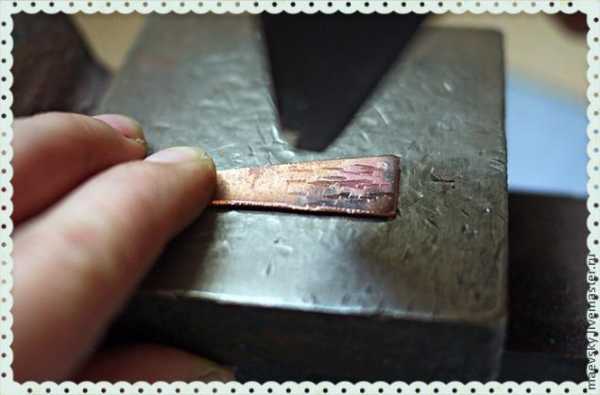 Отжигаем медь над газовой плитой или в пламени газовой горелки. Делаем это для того, чтобы медь стала пластичной. Деталь держим плоскогубцами, чтобы не обжечься. После охлаждаем медь под струей воды или в заранее приготовленной емкости с водой.