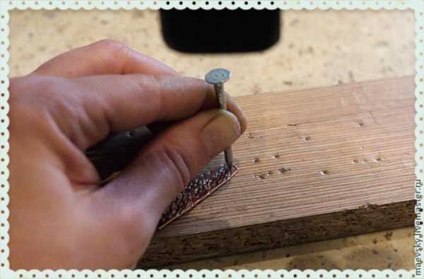 Теперь нам нужно сделать отверстия в медных детальках. Для этого я взяла обычный гвоздь и все тот же молоток и хорошенько стукнула. Под медную пластинку нужно подложить какую-нибудь ненужную деревяшку, а то можно пробить заодно что-нибудь полезное.