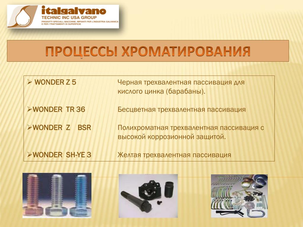 Желто-радужную пассивацию. Данный вид обработки оцинкованной поверхности изделий из металла может сочетаться с хроматированием, что и приводит к её окрашиванию в желто-радужный цвет. При этом металл погружается в специальный состав, содержащий хроматы и биохроматы. Защитный слой имеет толщину 9-12 мкм.