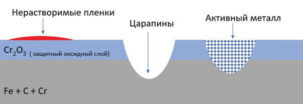 Тонкий слой оксида хрома обеспечивает характерную устойчивость к пятнам и коррозии, которыми славится нержавеющая сталь. Этот слой образуется, когда поверхность стали подвергается воздействию кислорода. Однако если поверхность стали загрязнена или повреждена, это может препятствовать естественному образованию оксидного слоя.