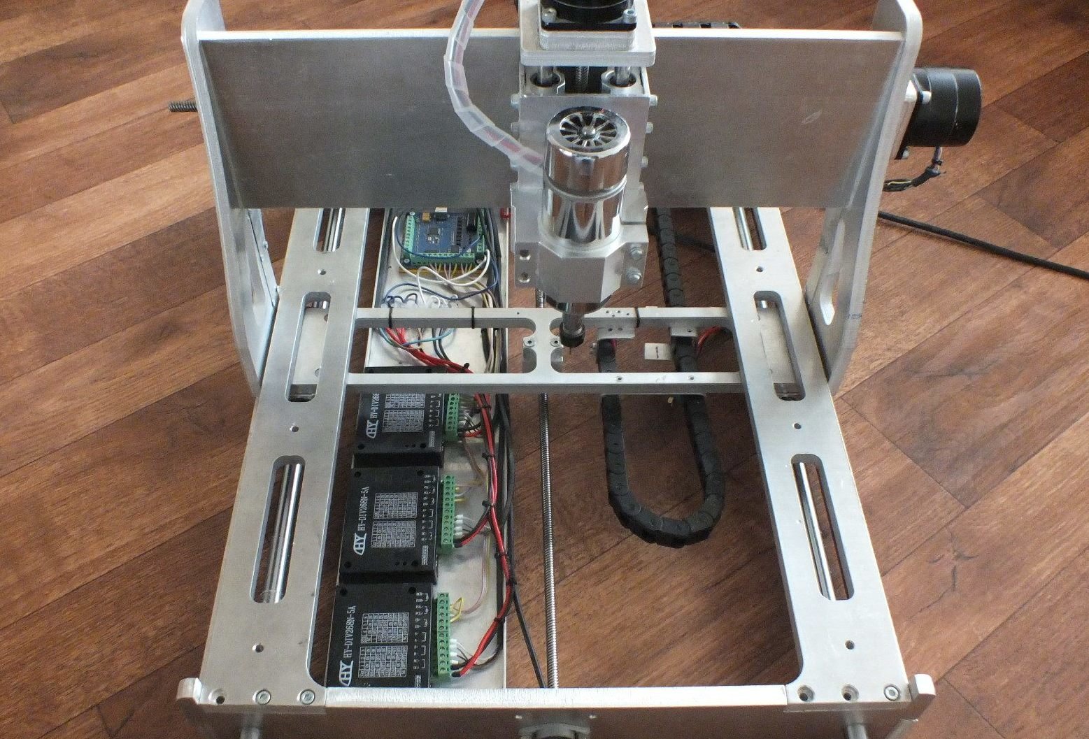 Вот и все. Станок получился удобный, стройный, я бы даже сказал поджарый, ничего не торчит, к рабочему полю хороший доступ со всех сторон, никаких кожухов, которые чего-то там прикрывают, нет «гусениц» для проводов, все провода спрятаны. Кстати, в моем экземпляре контроллер тоже спрятан под стол, к станку подходит только шнур питания и кабель LPT порта от компьютера.