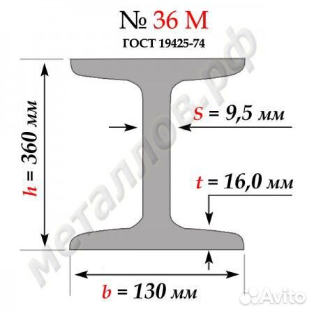 В маркировке проката обозначен ряд параметров. Цифра – высота двутавра (в сантиметрах округленно, с учетом толщины пары полок и длины стенки). В нашем случае 36 см или по ГОСТ 19425-74 – 360.0 мм. Буква это категория проката. М – обозначает что балка двутавровая 36М монорельсовая.