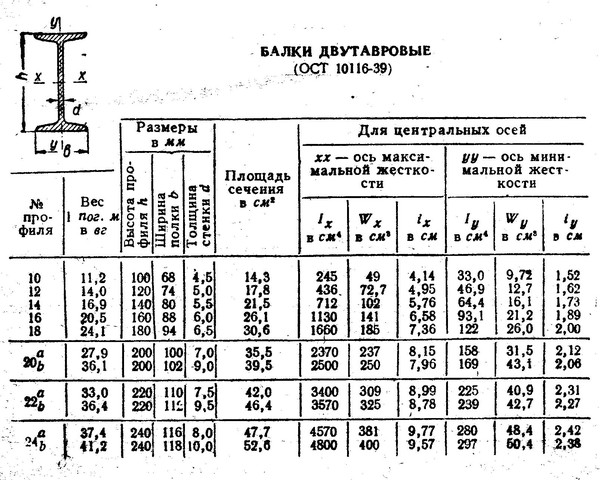 Балки двутавровые обыкновенные имеют уклон внутренних граней полок и обозначаются номером, соответствующим их высоте в сантиметрах.