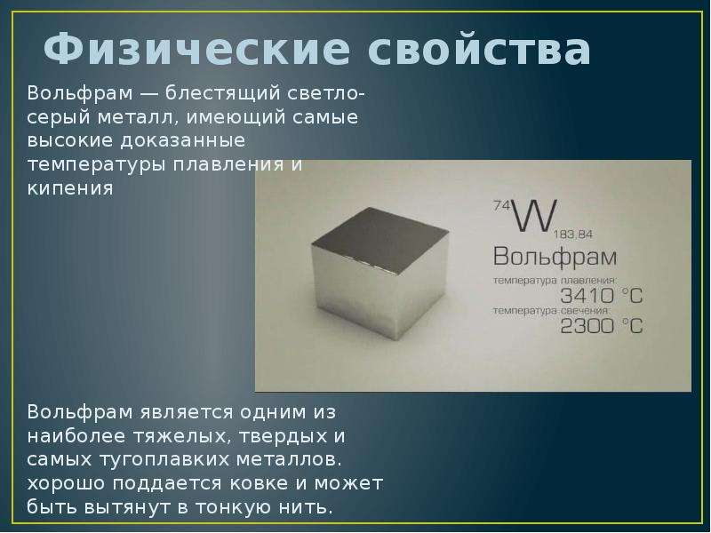 Молибден — серебристо-серый металл с очень высокой температурой плавления (шестое место в периодической таблице). Он может образовывать стабильные и твердые карбиды в сплавах. Большинство соединений, содержащих молибден, очень плохо растворяются в воде.