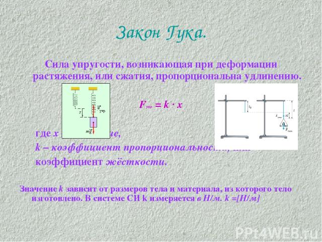 для тела выполняется закон Гука, который гласит: упругая сила пропорциональна