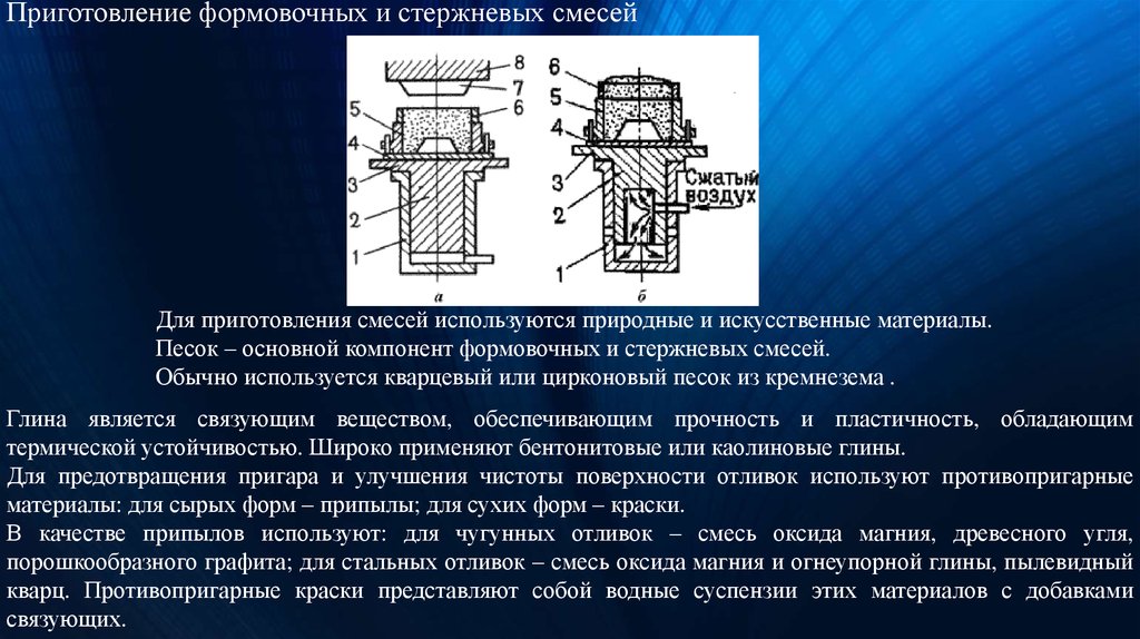 Очень широко применяется песчано-глинистая смесь на основе жидкого стекла. Использование таких материалов существенно снижает продолжительность технологического процесса, увеличивает производительность и качество изделий. Однако существуют трудности с использованием регенерата.