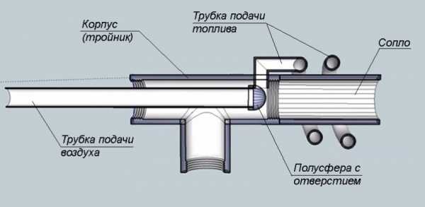 Сам инжектор – цилиндр с несколькими каналами: по центральному подается кислород, по нескольким периферическим канальцам – горючий газ. За счет этого достигается разница давлений.