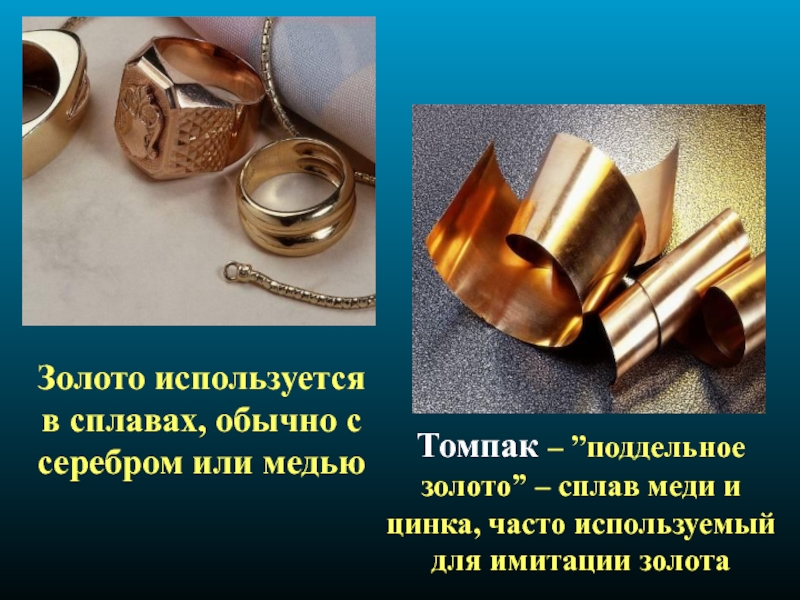 Золото представляет собой золотисто-желтый металл (tпл = 1064оС), настолько мягкий и пластичный, что легко раскатывается в тончайшую фольгу, которую можно растереть в порошок. «Золото через свой изрядно жёлтый цвет и блещущую светлость от прочих металлов отлично», — писал о нем М.В.Ломоносов.