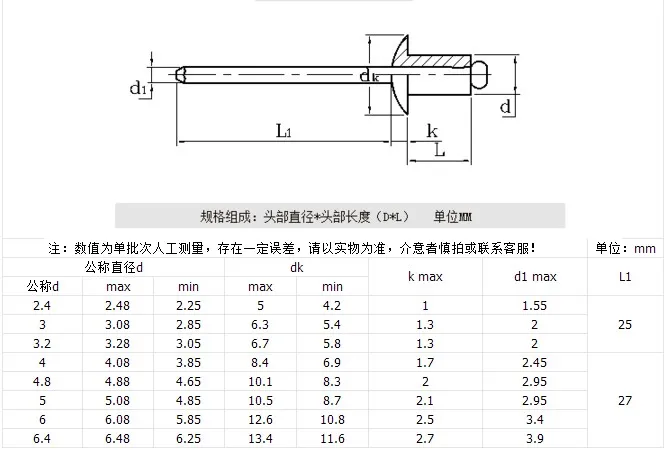 Корпус заклепки | ном. | 2,4 | 3 | 3,2 | 4 | 4,8 | 5 | 6 | 6,4 | ||