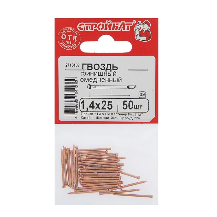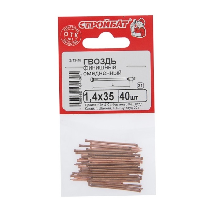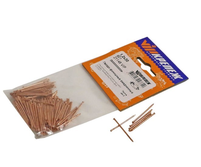 - Гвозди финишные омедненные. Слой элемента Cu привносит на поверхность крепежных деталей красный оттенок и отличную стойкость к образованию ржавчины при длительном пребывании в воде. Поэтому такие элементы фиксации успешно применяются для формирования обшивки лоджий/балконов и даже бань, не говоря уже о ванных комнатах.