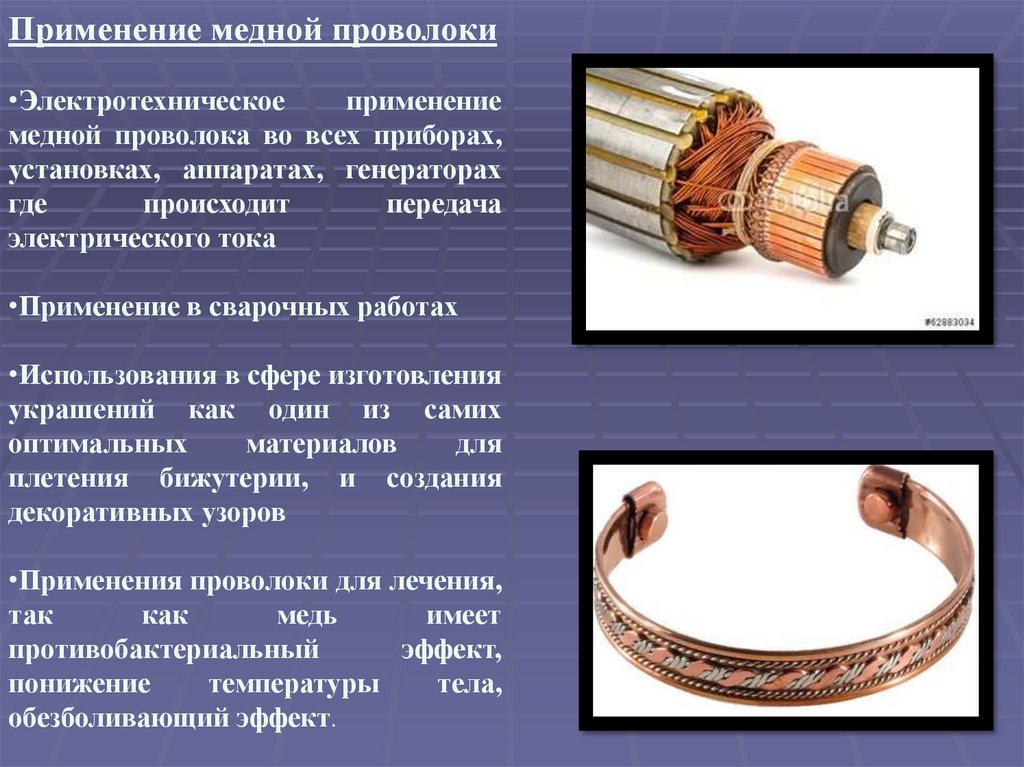 Медный провод используется для передачи электрического тока из одной точки в другую. Его также можно использовать для рассеивания тепла, электрического сопротивления и теплопередачи. Гибкость и прочность меди делают ее отличным выбором для этих применений.