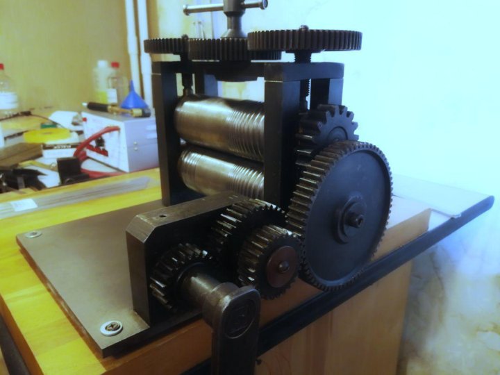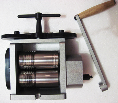 Следующим шагом прокатываем серебряный брусок через вальцы, постепенно уменьшая зазор. На вальцах имеются ручейки различного размера сечения, через которые происходит прокатка бруска от большего размера сечения ручейков к меньшему, в зависимости от желаемого диаметра проволоки. В данном мастер-классе я изготовил проволоку диаметром 0,8 мм. При переходе к меньшему размеру ручейка желательно отжигать брусок газовой гарелкой (перед отжигом необходимо смачивать брусок флюсом для избежания окисления), т.к. в процессе прокатки под действием давления меняются механические свойства сплава (твердость, пластичность…), как следвие изменения кристалической структуры сплава. В ходе отжига восстанавливается кристалическая структура сплава и меняются механические свойства в сторону увеличения пластичности и уменьшения твердости сплава.