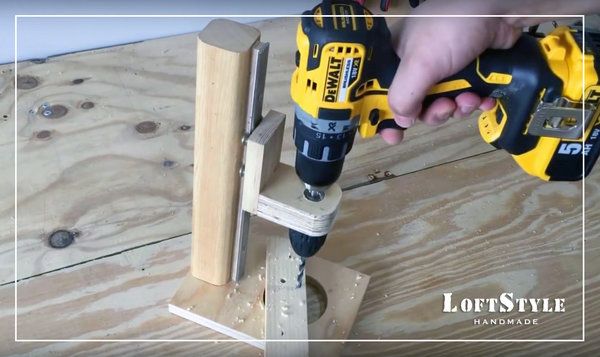 Остается установить дрель, закрепить ее и выполнить пробное сверление. Как раз в ходе него будет просверлено технологическое отверстие в столешнице, в месте выхода сверла, которое позволит работать с материалом любой толщины.