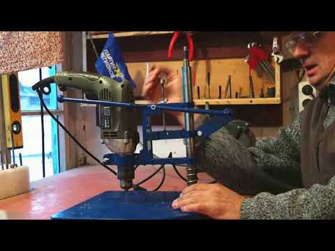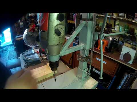 Самодельный сверлильный станок, сделанный из дрели, фанеры и других материалов