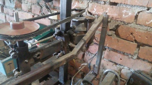 Отлично подойдет двигатель от старой стиральной машины. Передача вращения осуществляется с помощью ременной передачи. Лучше использовать шкив с несколькими ручьями, это позволит регулировать скорость, тем самым работать с материалом разной твердости. По такой же схеме делают своими руками присадочные станки.