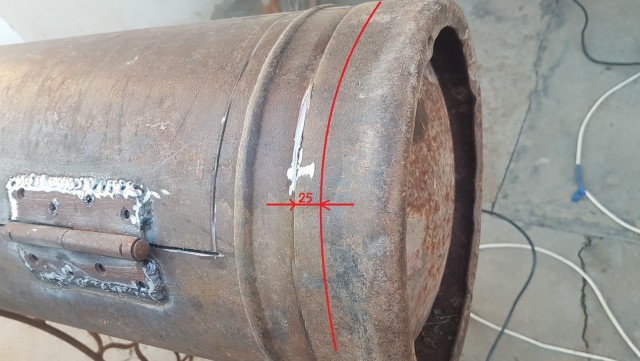 - В окружности стандартный газовый баллон на 50 л имеет 96 см. Взяв за точку отсчёта продольный соединительный шов, делим всю окружность на четыре равные части по 24 см каждая. Таким образом, отмерив 24 см от шва в правую сторону, проводим вдоль баллона прямую линию, по ней будем разрезать ёмкость.