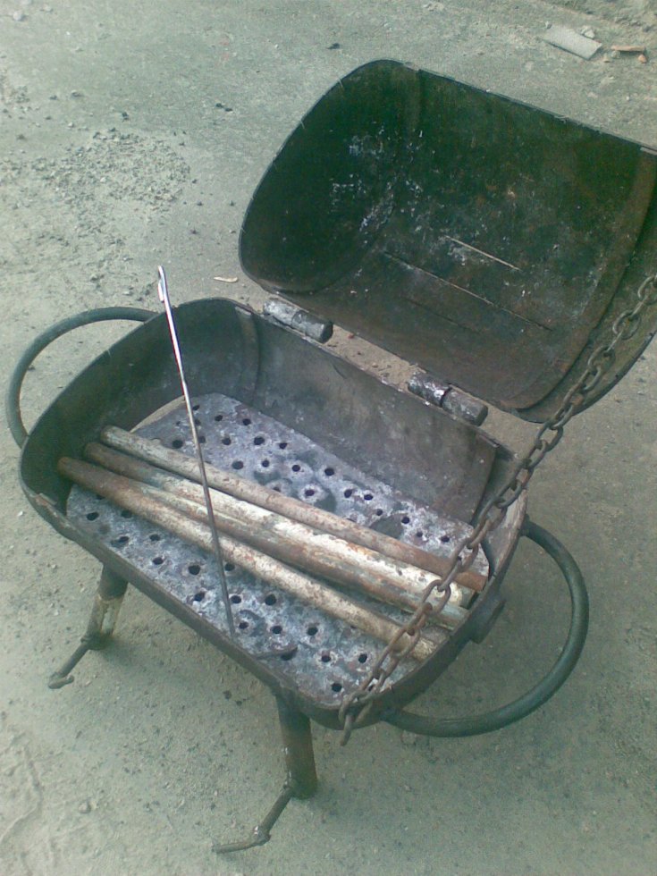 Для того, кто желает иметь ещё и необычное изделие, можно изготовить мангал — паровоз. Для этого нужно превратить основную часть на мотор и приделать к нему из уголка, арматуры и листового железа крышу. Такой мангал может объединить в себе гриль, барбекю и коптильню.