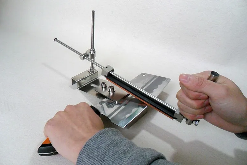 Чтобы научиться пользоваться самодельным приспособлением такого типа, несколько раз потренируйтесь на старых ножах.