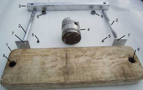 Материалы: мотоциклетный поршень, уголок либо шток, длинные болты, шурупы, доска гайки.