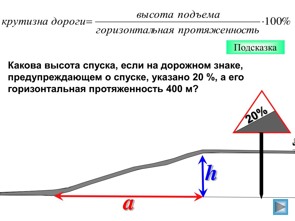 Если стоит знак «10%», то это значит, что, проехав примерно 100 м по дороге на горку с крутизной уклона в 10%, машина поднимется на высоту 10 метров. Тем самым проценты на знаках можно представить и как количество метров, на которые проезжая часть опустится или поднимется через расстояние, кратное 100 м.