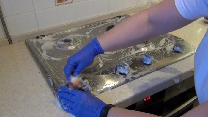 — Пищевая сода. Подходит для поверхностей с поврежденным покрытием. — Чистящий крем «Сиф» убирает загрязнения, справляется с маслом и жиром. — Мел хорошо полирует, не царапая поверхность. — Зубная паста или порошок. Мелкий абразив удаляет лёгкий налёт. — Паста ГОИ разработана для стекла, отлично чистит металл. Имеет 3 размера зерна. — При наличии опыта разводы ржавчины уйдут, а поверхность будет блестеть.