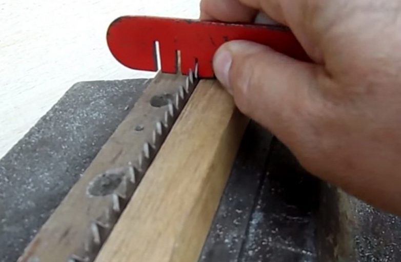 После таких манипуляций рекомендуется проверить правильность совершения разводки, ведь может случиться, что некоторые зубья при отгибе на сторону больше выступают, чем остальные, они будут тормозить при пилении, снижать качество пропила и быстро затупятся. Посмотрите по линии зубьев на свет, и если увидите, что какой-то зуб слишком сильно или недостаточно отогнут в сторону, то его нужно поправить.