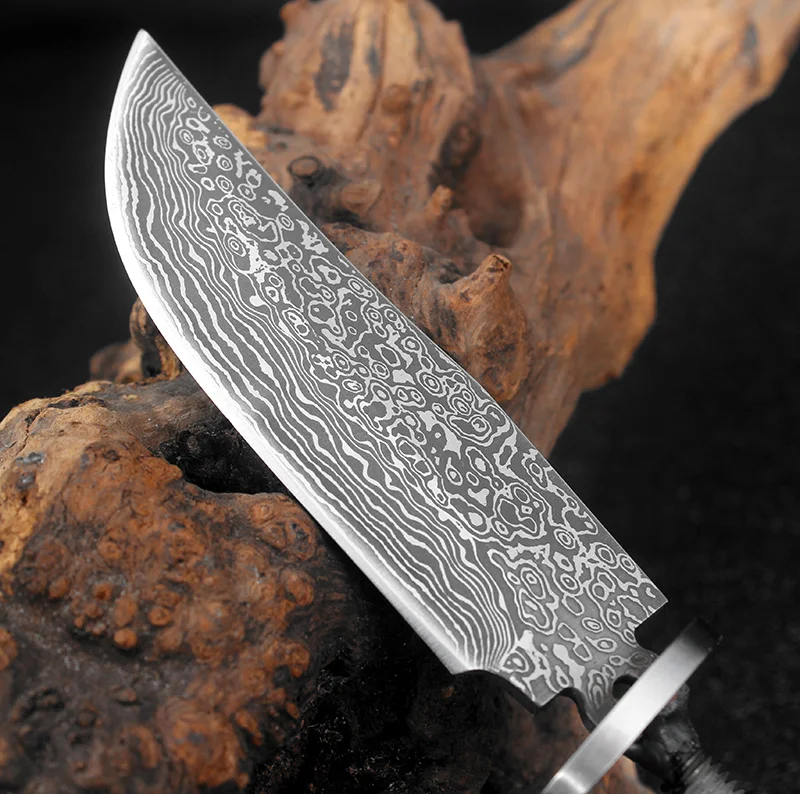 С первого взгляда на клинки из дамасской стали, невольно отмечаешь красивый рисунок на них – это результат причудливого переплетения нескольких материалов с разным содержанием углерода. Дамаск не только красив: он примечателен своей прочностью – 60-62 по Роквеллу. Это значит, что клинок из такого материала без труда справится с резом даже очень твердых поверхностей, например, кости или древесины.