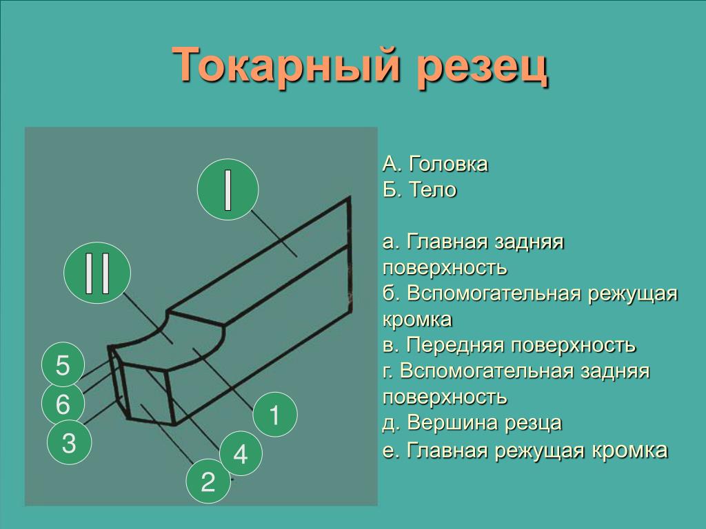 Ниже приведены элементы резца на примере токарного прямого проходного резца.