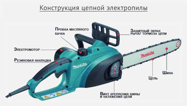 Цепная электропила считается безопасным с позиций экологического воздействия инструментом – отсутствие вредных выхлопных газов допускает возможность ее использования в помещении. Конструктивно выделяют следующие основные части: