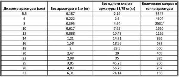 Именно столько рифлёной арматуры понадобиться, чтобы сделать армо-каркас для пятистенка размером 10 на 10 метров. Поскольку цена почти на весь металлический прокат исчисляется исходя из его массы, то погонные метры нам будет нужно перевести в тонны. Воспользуемся для этого ещё одной схемой, показывающей соотношение длины проката к его массе.