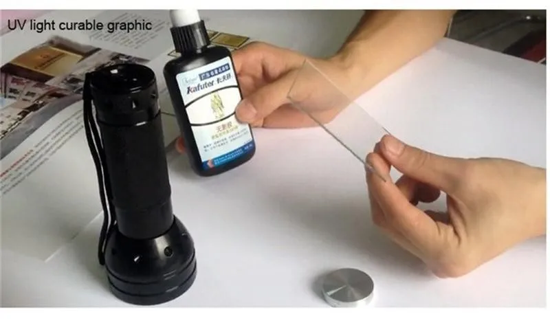 Самой главной составляющей процесса будет являться УФ-клей (полимер ультрафиолетового отверждения). Кроме этого, нужно будет запастись средством очистки стекла, феном, а также светильником с ультрафиолетовой лампой. Здесь необходимо отметить, что не каждая синяя лампа подойдёт для этих целей. Требуемая длина световой волны от 300 до 400 нм. Поэтому кварцевая лампа для загара нам точно не подойдёт.