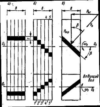 При строгой параллельности зубьев и осей О 2 О 2 и O 1 O 1 прямые зубья входят в зацепление по всей длине В (рис. 17, а)
