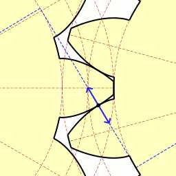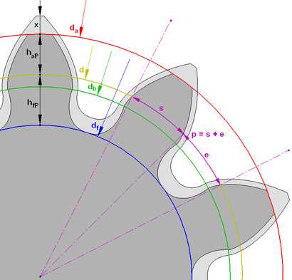 - haP+hfP — высота зуба тёмного колеса, x+haP+hfP — высота зуба светлого колеса
