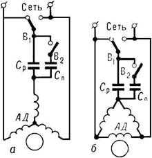 статора, соединенными по схеме “звезда” (а) или “треугольник” (б): B1 – переключатель направления вращения (реверс), В2 – выключатель пусковой емкости; Ср – рабочий конденсатор; Cп – пусковой конденсатор; АД – асинхронный электродвигатель |