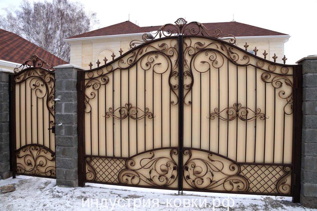Такие изделия объединяют преимущества: непрозрачность, прочность, безопасность, профнастила и красота ковки. Верхнюю часть можно украсить стилизованными штырями, завитками, другими художественными элементами. Фрагменты можно наваривать на поверхность листа створки.