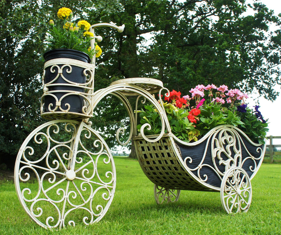 1. Подставка для цветов из велосипедаСтарый велосипед будто создан для того, чтобы стать декоративной основой для горшков с цветами. Достаточно просто достать из сарая старое средство передвижения и поставить на него емкости с растениями. Если у велосипеда совсем уж непрезентабельный вид, его можно целиком выкрасить в какой-нибудь один или несколько цветов.