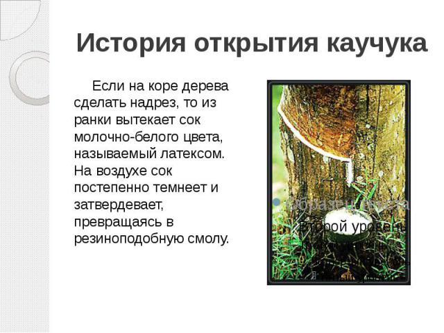 История каучука весьма увлекательна. Истории о том, как был открыт каучук, различаются в зависимости от того, кто рассказывает эту историю. Одна история рассказывает об индейской женщине майя, которая шла по тропическому лесу, собирая съестное, когда наткнулась на плачущее дерево. Она отнесла образец слез вождю племени, который нашел латексное вещество уникальным.