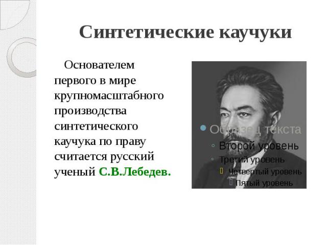 В 1901 г. русский ученый-химик Кондаков доказал, что в каучукоподобное вещество, помимо изопрена, превращается и диметилбутадиен, если в течение года держать его на рассеянном свету или в темноте. Правда, изделия из синтетического каучука, полученного из диметилбутадиена, были дорогими и низкого качества. В 1914 год англичанам Стренджу и Мэтьюсу удалось получить в лабораторных условиях каучук из дивинила. Однако им не удалось найти способ получения дивинила и создать установку для синтеза каучука на заводе. Через 15 лет академик С.В. Лебедев разработал способ получения синтетического каучука промышленным путем. В качестве исходного материала ученый взял дивилин, отказавшись от изопрена. Прежде всего необходимо было найти способ получения дивинила из легкодоступного и дешевого сырья. Таким исходным сырьем стал спирт. В качестве катализатора послужила глина из Коктебеля. В середине 1927 г. из спирта Лебедеву удалось получить дивинил. Полимеризация дивинила была сделана по способу Мэтьюса и Стренджа. Полученный каучук разминали с содержащимся в нем натрием в мешалке, а после смешивали с усилителями, каолином, сажей, магнезией и прочими компонентами, которые бы предохраняли каучук от разложения. К концу 1929 года Лебедевым была разработана и представлена технология заводского процесса. Уже в феврале следующего года приступили к строительству опытного завода в Ленинграде. В феврале 1931 года впервые в мире были получены 250 кг дешевого синтетического каучука промышленным способом. Позже были найдены еще ряд способов получения синтетического каучука.