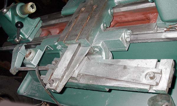 Я сделал толкатель для каретки из двух кусков горячекатаного стального прутка. Нижняя часть входит в Т-образный паз, а верхняя часть зажимается над ним. На дальнем конце стальной штифт диаметром 1/4 дюйма проходит через оба стержня против линейки. Чтобы настроить точение конуса, я делаю следующее: